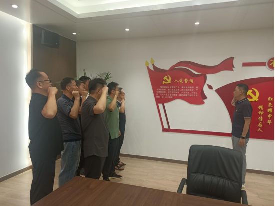 重温入党誓词环节。在党旗前,党员们整齐列队、高举右拳,以最直接、最实际、最生动的党性教育,一起重温入党誓词。铿锵恢宏的誓词,一字一句,神圣而豪迈,表达对党的热爱与忠诚,展现党员全心全意为人民服务的信心与决心。